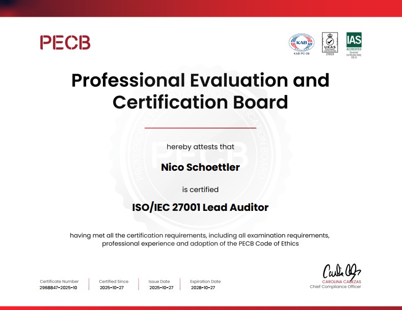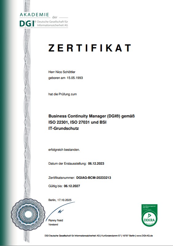 Ich bin Nico Schöttler, leidenschaftlicher Berater für Informationssicherheit, Business Continuity Management (BCM) und IT-Service-Management (ITSM). Mein Antrieb: Unternehmen sicherer, widerstandsfähiger und effizienter zu machen – mit praxisnahen, individuellen Lösungen, die wirklich funktionieren.